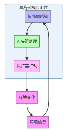 具身人工智能是指AI系统嵌入物理实体(如机器人、无人机、智能设备等)中,通过传感器感知环境,经过计算决策,最后通过执行器作用于物理世界,实现感知-决策-行动的闭环系统。与传统的纯软件AI不同,具身AI强调"身体"对于智能形成的重要性。