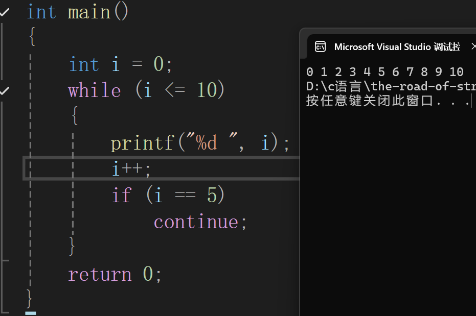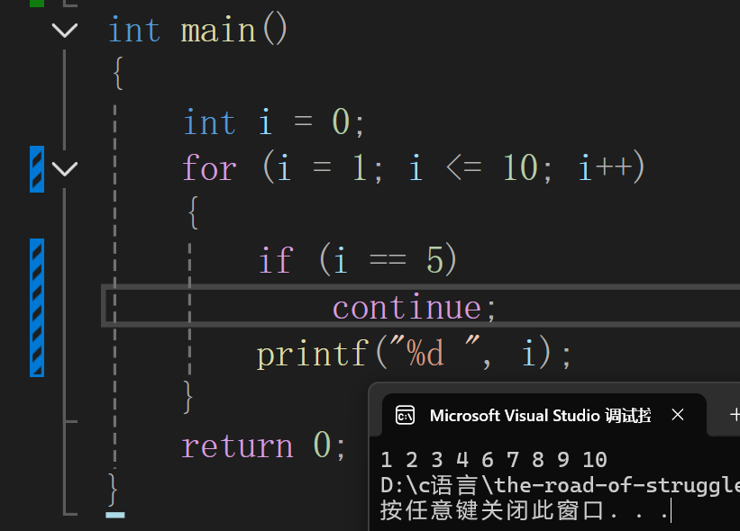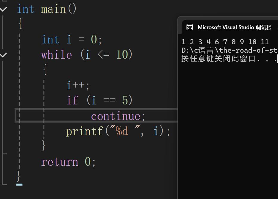 我们直接从i==5开始看,当i==5时if判断成立为真,执行continue,跳过printf语句,因为此时i==5,所以5就不会被打印,进入下一个循环,所以代码执行结果为1 2 3 4 6 7 8 9 10.