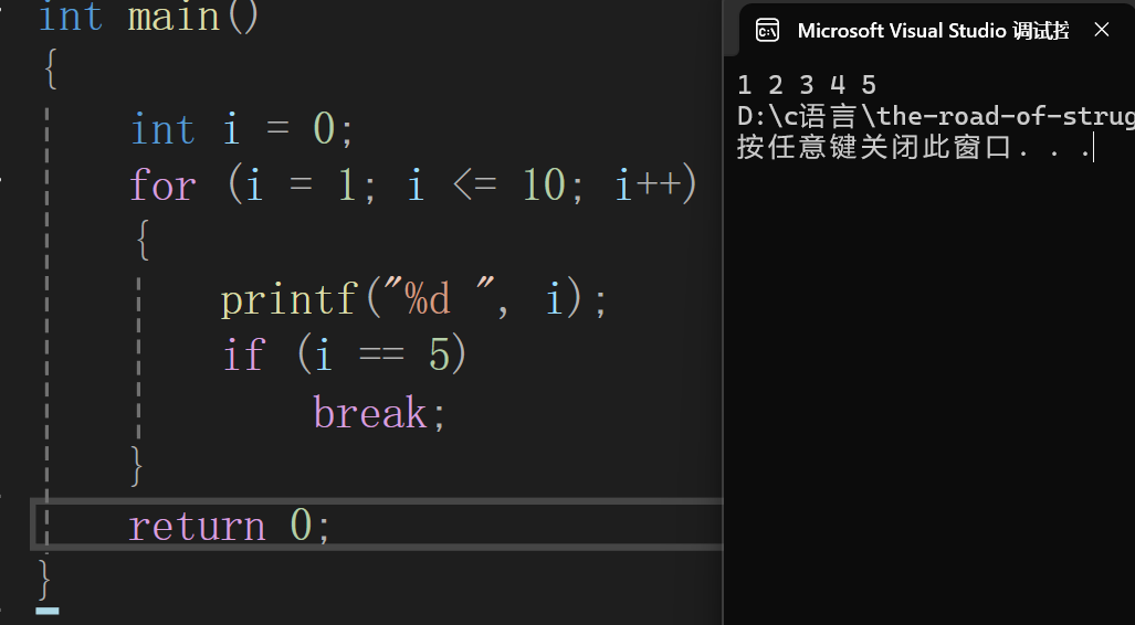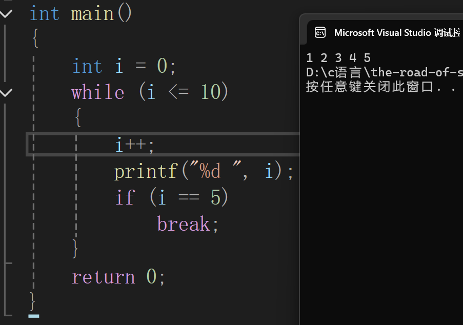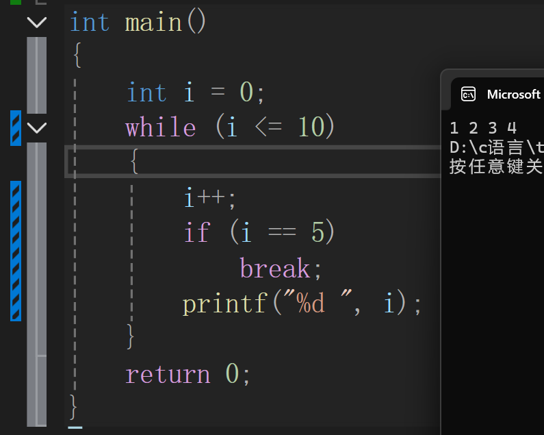 第四次循环i=4,判断i<=0是否为真,为真则运行循环体里的代码,输出4,再次判断i==5是否为真,为假则break不运行,最后i++,此时i=5,再次进入循环.此时运行结果为1 2 3 4