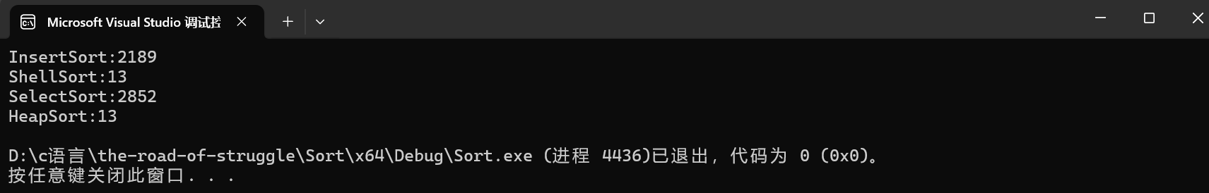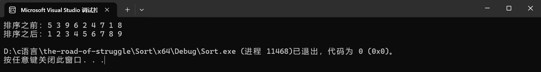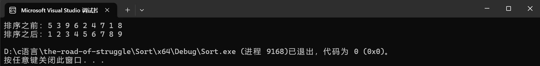 测试完成,打印没有问题,升序排列正确,退出码为0