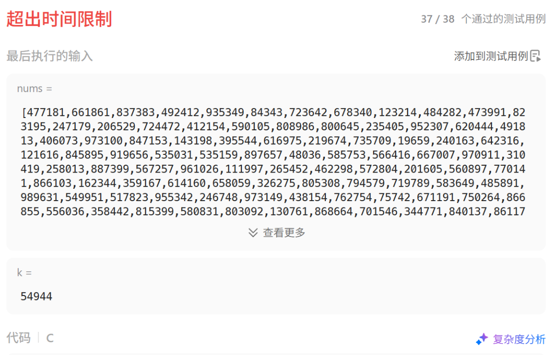 我们可以发现,自测运行是可以通过的,但是提交后会提示我们超过时间限制,那说明我们设计的算法不够好,效率不够高,我们需要通过算法复杂度来分析其好坏,效率高低。
