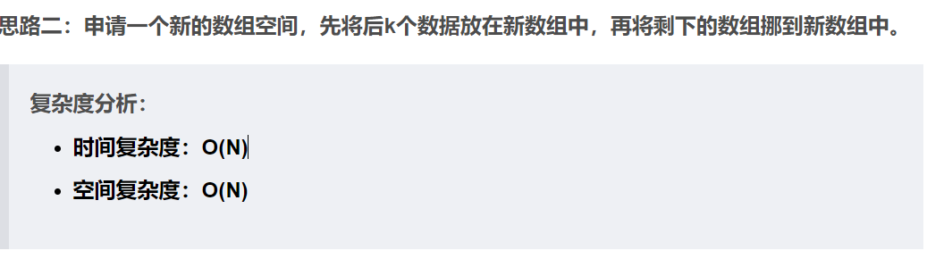 }思路二:申请一个新的数组空间,先将后k个数据放在新数组中,再将剩下的数组挪到新数组中。