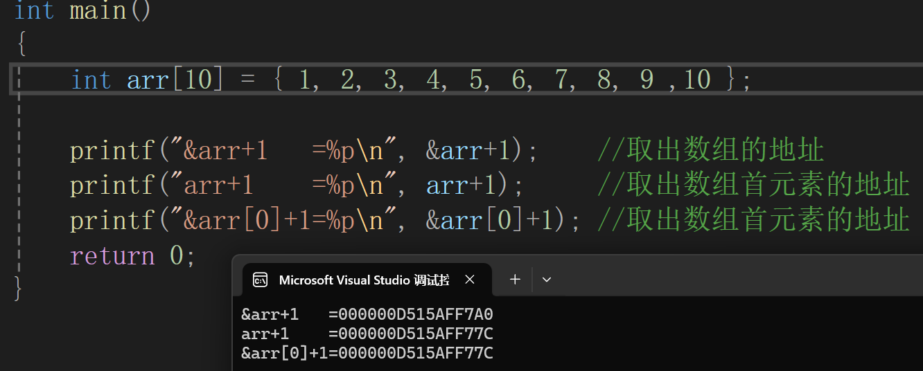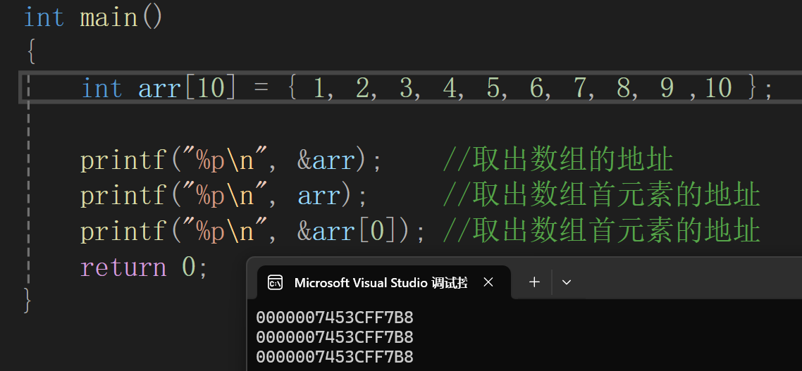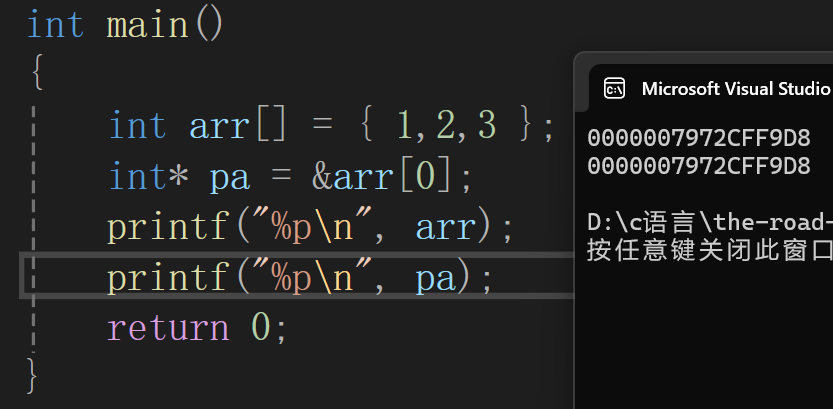 因为我们都知道数组名:arr就是首元素地址,而pa里存放的是&arr[0]也是首元素地址,所以二者打印结果固然一样。