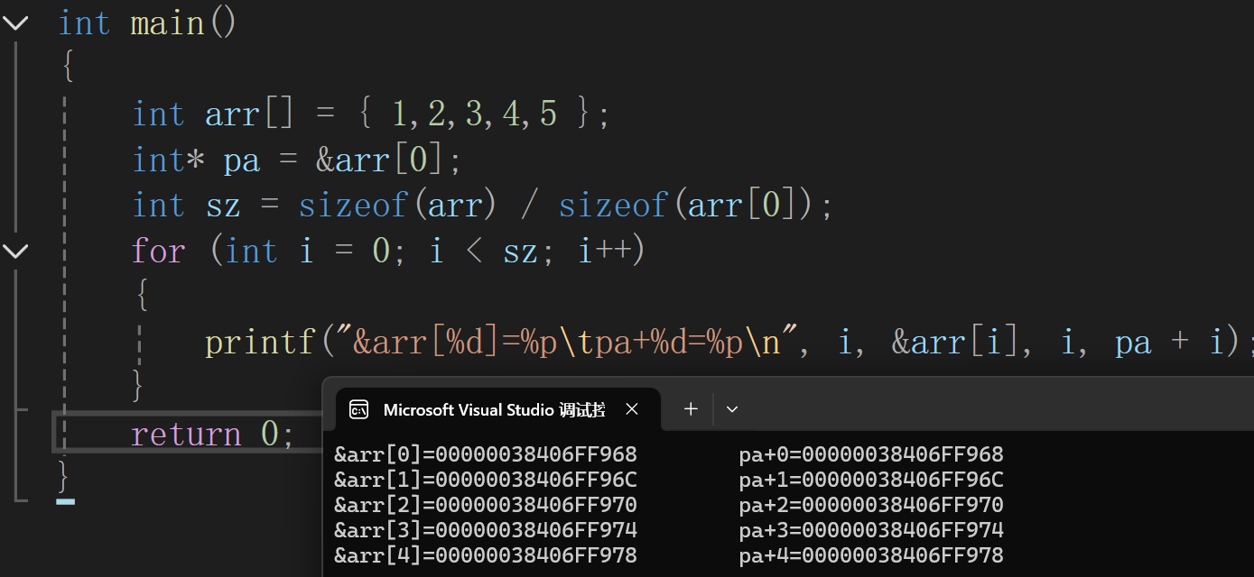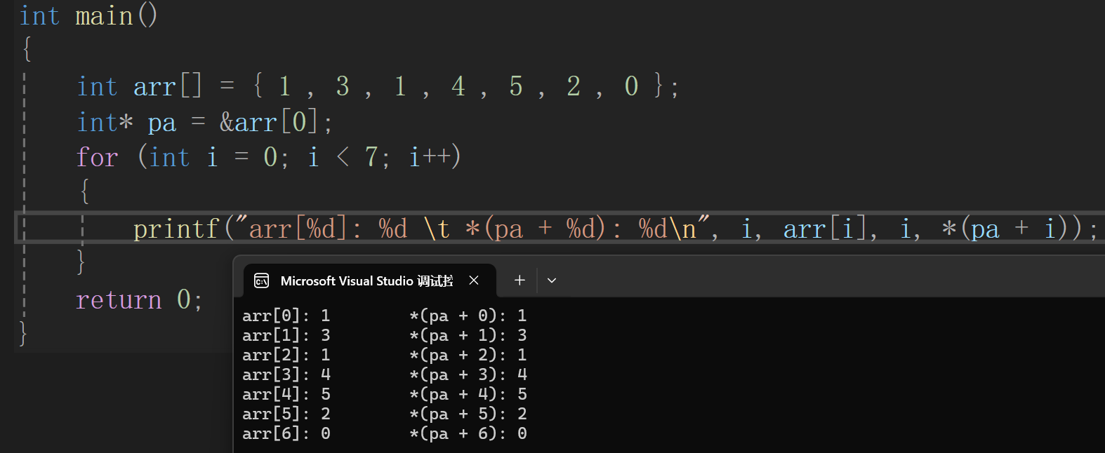 我们可以看到打印的结果也是一样的,这里我们就运用到了指针+-整数的运算了,pa表示首元素地址,+-i就一个一个往后跳,知道数组遍历完全,这里我们又得到结论:指针(地址)+-整数也可以遍历整个数组