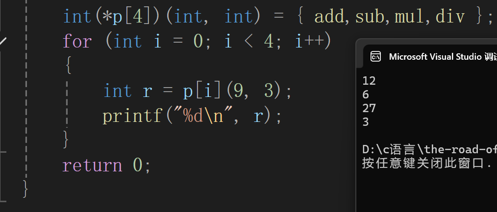 }这里我定义了四个函数分别是add,sub,mul,div分别表示加减乘除,那如果我们想要创建函数指针,就要创建四个函数指针,这样就会造成代码的冗余,所以我们可以设置一个函数指针数组,数组里存放这四个函数指针,函数指针数组与函数指针的写法非常相似,只需要在指针变量名之后加上[ ]即可,这里方括号里是函数的个数,然后我们用for循环进行加减乘除,这里p[i](参数,参数),i表示的就是add,sub,mul,div,里面的参数就是自己要进行加减乘除的数字,打印出来的结果大家可以看一下: