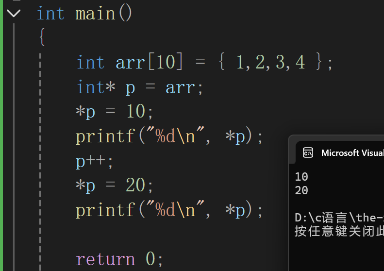 } 这里我们定义了一个整型数组arr,我们都知道数组名就是首元素地址,我们上面也说明了地址就是指针,所以我们也可以说数组名也是指针,这里p存放的是1的地址,这里我们解释一下*p:‘*’就是解引用的作用,因为p里存放的是1的地址,我们如果想要找到1,就只需要在p前面加上*即可,这时候就找到1了,然后我们*p=10,就是把1赋值为10,这里数组1的位置就改为了10,然后打印出来,这时候p++,p存放的是1的地址,p++就是2的地址,解引用*p=20,就把2的值改为了20,打印。我们来看一下结果: