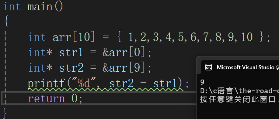 指针-指针:指针-指针的结果是两个指针之间所隔的元素个数,这种指针与指针之间的算术运算通常用于计算数组中两个元素之间的距离(所隔的元素个数),这里也一样给大家举个例子: