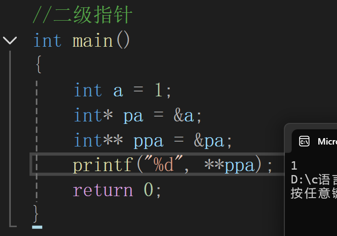 变量的地址是存放在指针里,那么指针的地址能否存放在指针? 答案是yes,指针变量也是有地址的,而存放指针变量地址的指针叫做二级指针,给大家举个最简单的例子: