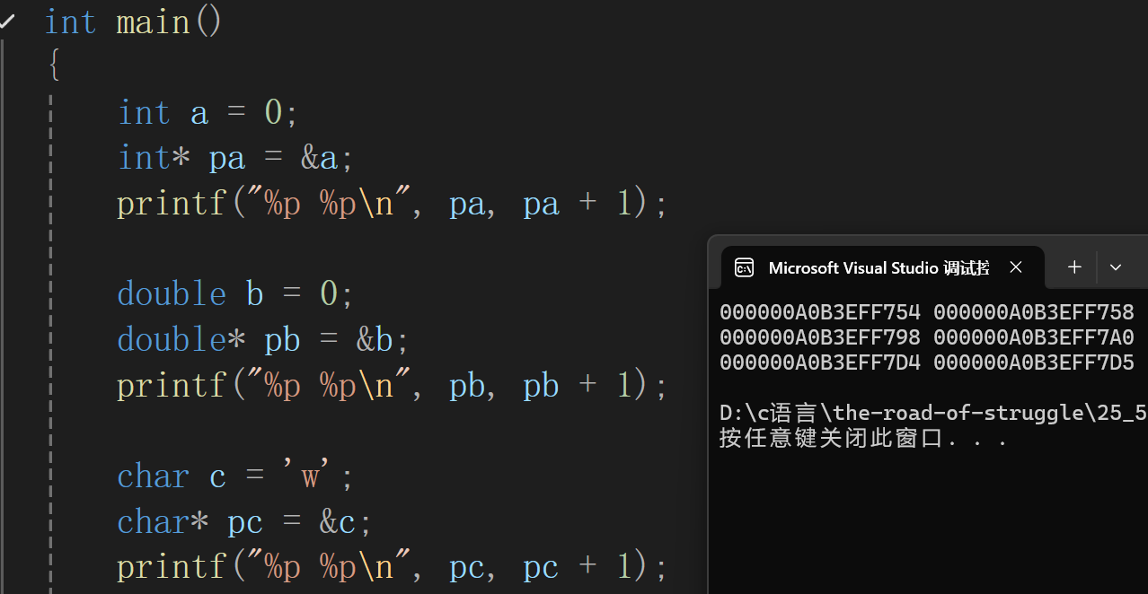 聪明的你发现: int 类型变量的大小刚好是4个字节 double类型变量的大小刚好是8个字节 char类型变量的大小刚好是1个字节 我们的到以下结论:指针±整数对应的是指针向前/向后移动的大小(指针指向变量类型大小 * 整数)