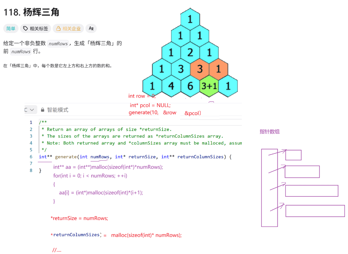麻不麻烦?麻烦!我们如果用C语言来实现的话,就要动态开辟二维数组——开辟指针数组,这个指针数组是指向数组的指针,或者这样理解:这个数组里面存放了指向数组的指针