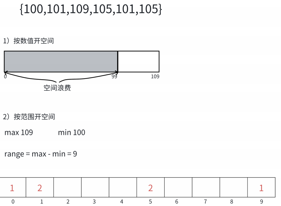 遍历数组,找到最大值和最小值,然后计算数据范围range=max-min+1确定数组的空间(避免空间浪费)