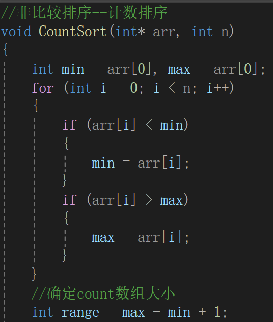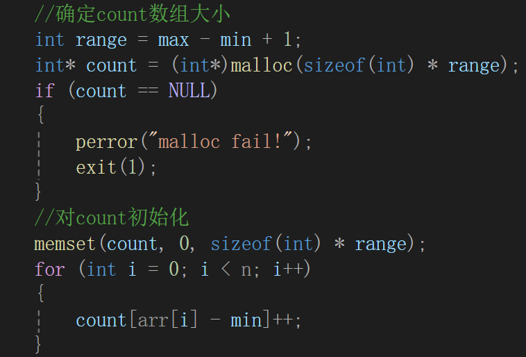 创建一个计数数组count,空间大小为range,并且要给count初始化(calloc或者memset),遍历原数组,将每个元素 arr[i] 映射到 count[arr[i] - min](减去 min 是为了处理包含负数的情况,一定要用arr[i]-min),统计每个值的出现次数。