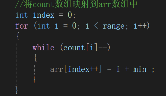 再定义一个index变量,作为原数组的下标,遍历count数组,根据count[i]统计到的个数进行映射i+min就是原数组的值,循环次数等于该值出现的次数,将数组的原始数据值放入arr原始数组中(对应原始值一定是i+min)