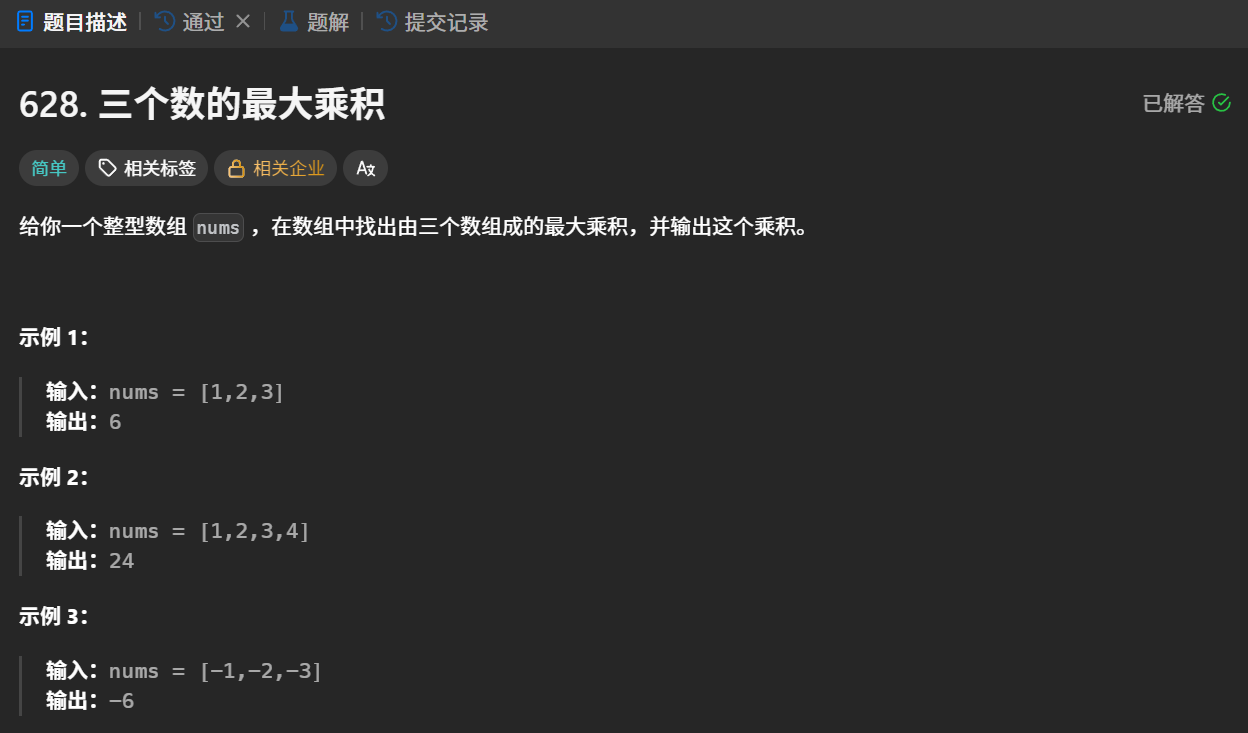 qsort将数组从小到大排序,由于数组中可能存在负数的情况,所以我们可以求数组前两位的积,如果前两位都为负数,那么乘积就为整数,再乘上数组最后一个元素,由于从小到大排序,所以最后三位元素一定是最大的,但是不能保证乘积最大,所以我们可以再求一下最后三位的乘积,来求这两个值的最大值