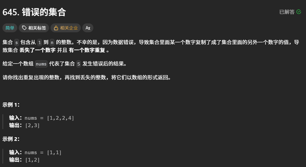 一个数组包含了1-n的整数,由于数据错误导致一个数字复制了另一个数字,此时数组里又两个数字一样,从而缺少了它本身应该正确的数字,要求返回重复的整数和丢失的整数,以数组的形式返回