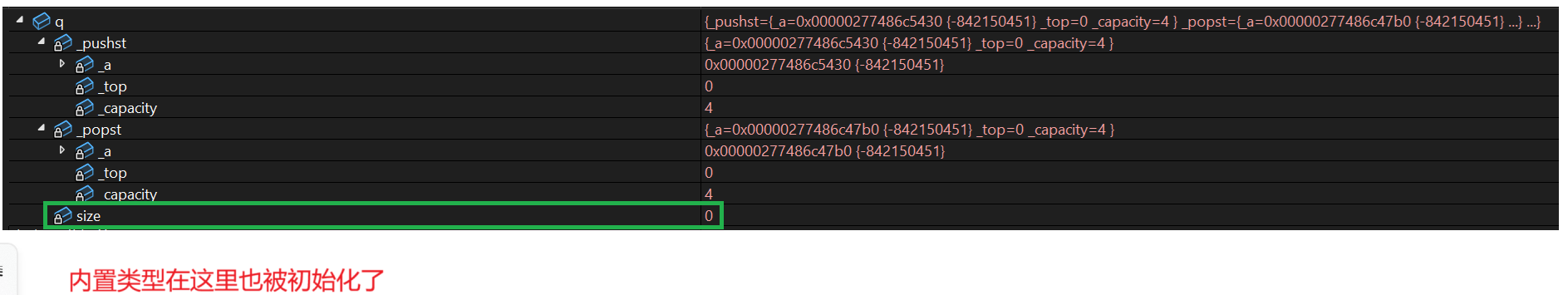 //编译器默认生成MyQueue的构造函数调用了Stack的构造函数,完成了两个成员的初始化