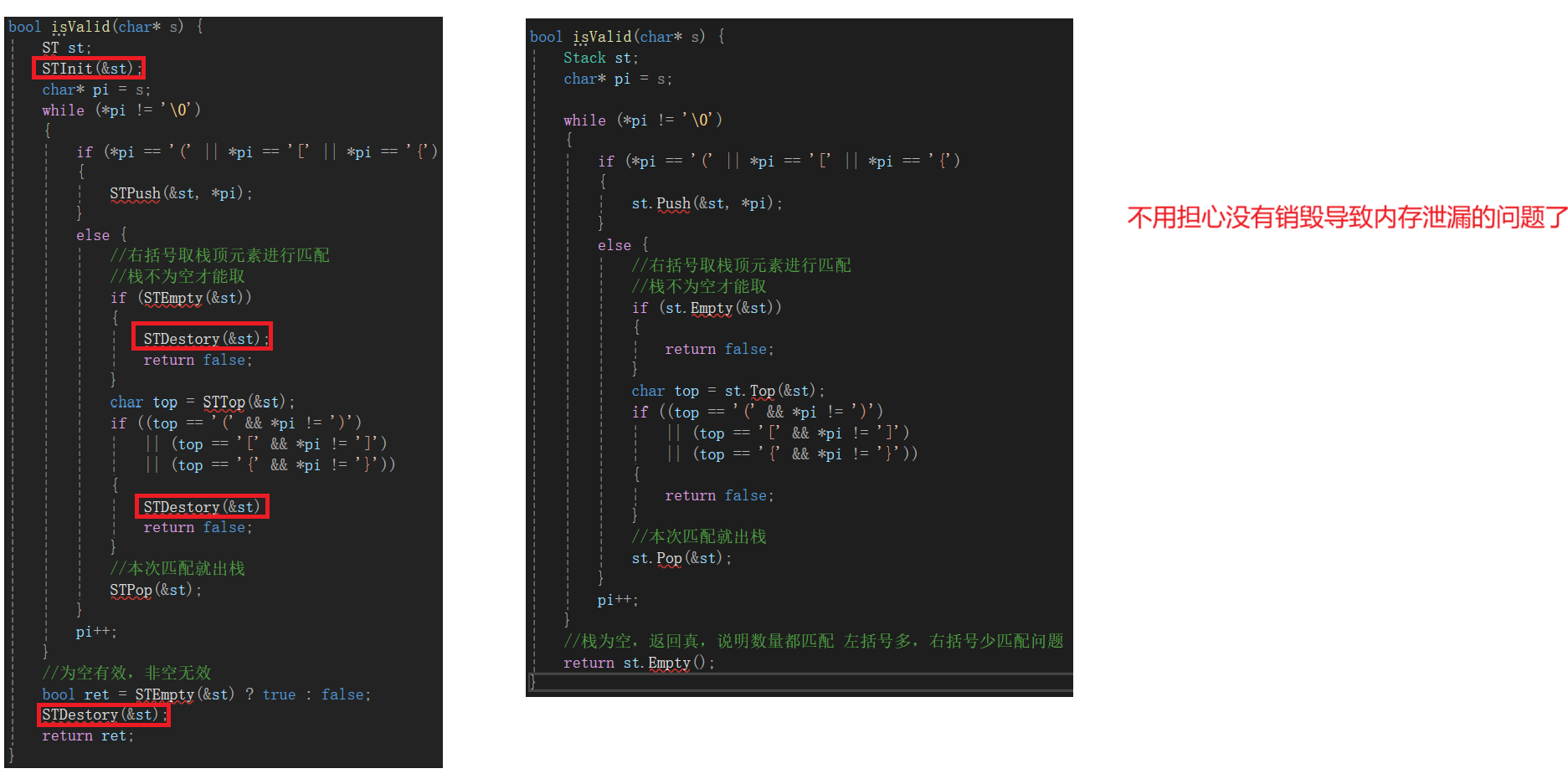 对比一下用C++和C实现的Stack解决之前括号匹配问题isValid,我们会发现有了构造函数和析构函数确实方便了很多,不会再忘记调用Init和Destory函数了(下面的两个实现都需要借用一下栈这个数据结构先,我这里就不展现出来了)。