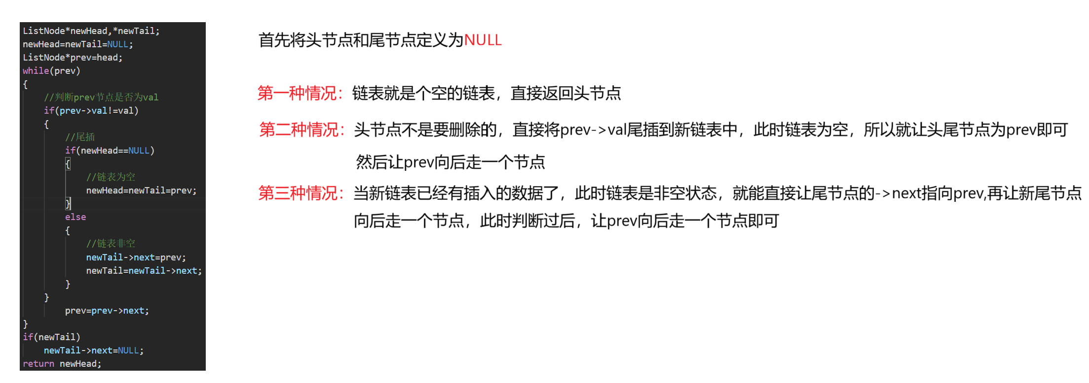 当头节点(新定义为prev)不为空时,进行遍历,此时再定义一个头尾节点(不在原链表基础上进行删改) 当头节点的val不是要删除的,直接进行尾插操作,如果判断链表为空(newHead==NULL),此时就让新头节点(newHaed)=新尾节点(NewTail)=prev,如果链表非空,prev的val直接尾插在尾节点的下一个节点,此时再让尾节点向后走一个节点即可,判断一个节点过后就可以让prev向后走一个节点再次进行上述判断,最后当prev为空,跳出循环,判断为尾节点不为空,就说明链表不为空,要将尾节点的下一个节点置为NULL,最后返回newHead即可