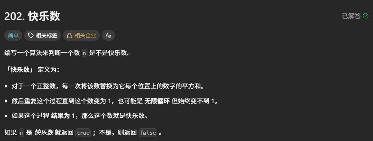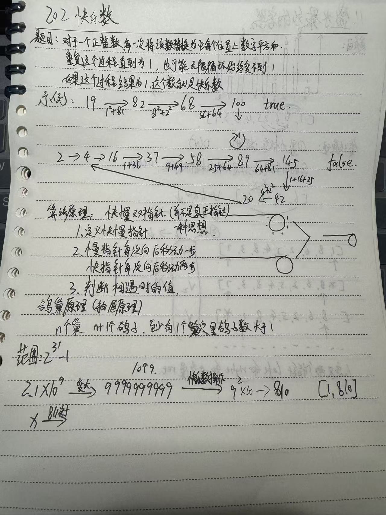 根据上述的题目分析,我们可以知道,当重复执行 x 的时候,数据会陷入到一个 【循环】之中。而【快慢指针】有一个特性,就是在一个圆圈里,快指针总是会追上慢指针的,也就是说他们总会相遇在一个位置上。如果相遇的位置的值是 1 ,那么这个数一定是快乐数;如果相遇的位置不是 1 的话,那么就不是快乐数。