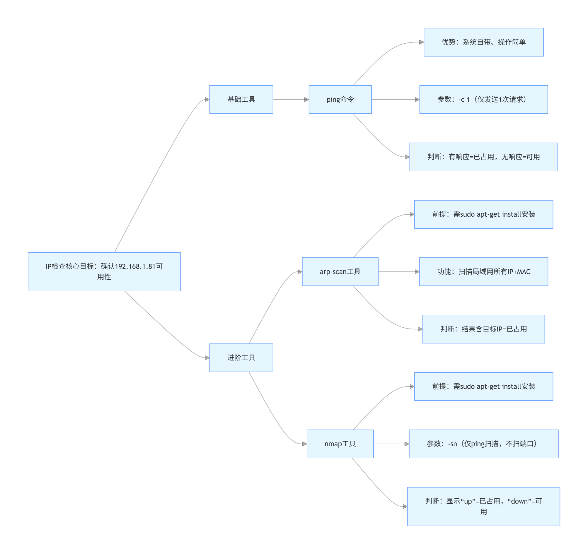 ping -c 1 192.168.1.81-c 1 表示只发送一次 ICMP 请求。arp-scan 工具arp-scan 是一个更强大的工具,可以扫描局域网内的所有设备并显示它们的 MAC 地址和 IP 地址。首先需要安装 arp-scan: