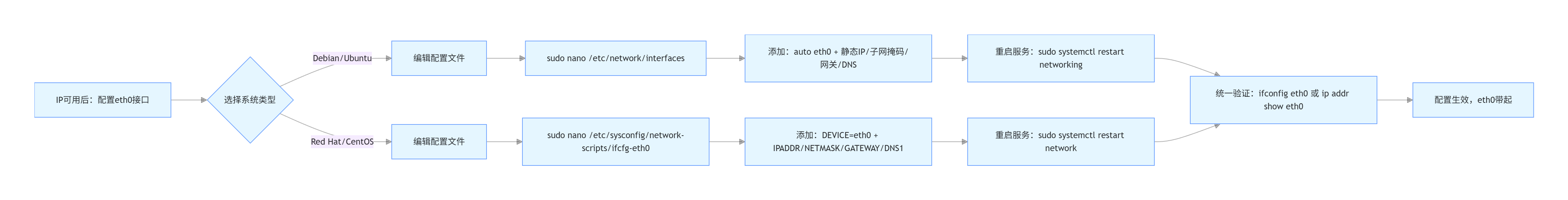 sudo systemctl restart networkingsudo systemctl restart network使用 ifconfig 或 ip addr 命令验证 eth0 接口是否已正确配置并带起。