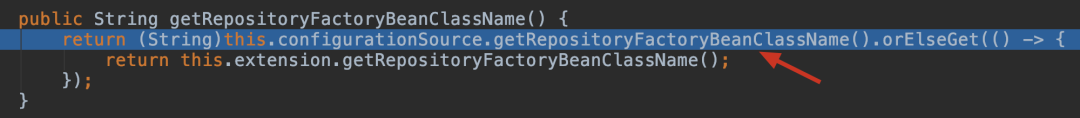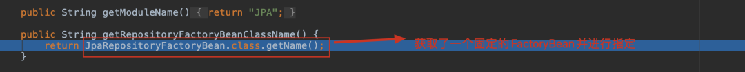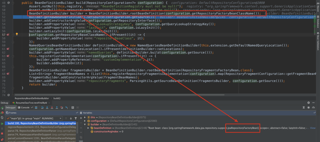 继续跟进,发现 BeanDefinitionBuilder builder = BeanDefinitionBuilder.rootBeanDefinition(configuration.getRepositoryFactoryBeanClassName());这行代码已经产生了JpaRepositoryFactoryBean。