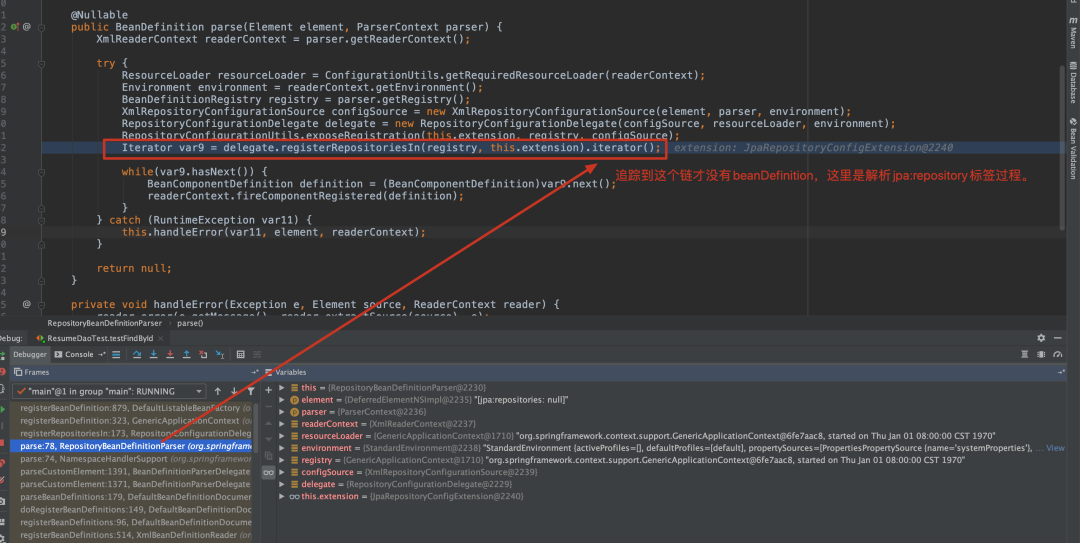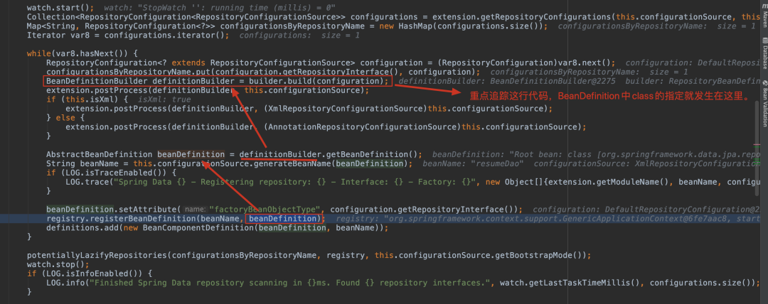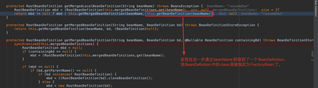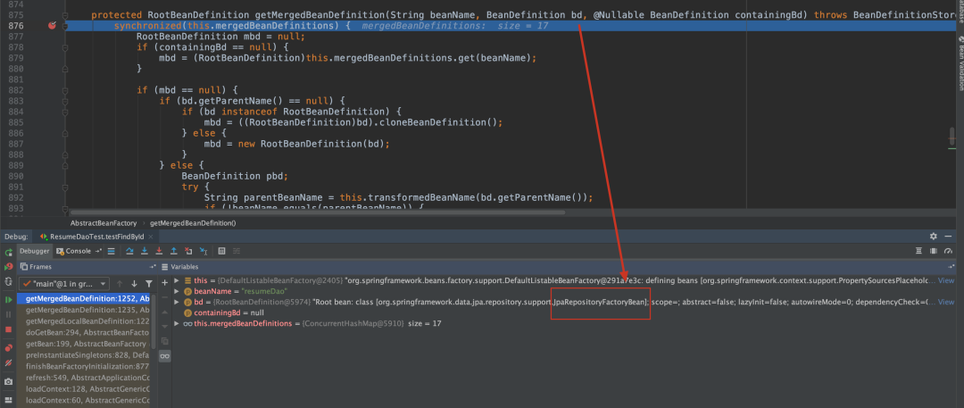 传入一个resumeDao就返回了一个已经指定class为JpaRepositoryFactoryBean的BeanDefinition对象了,那么应该在上图中的get时候就有了,所以断点进入: