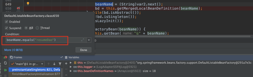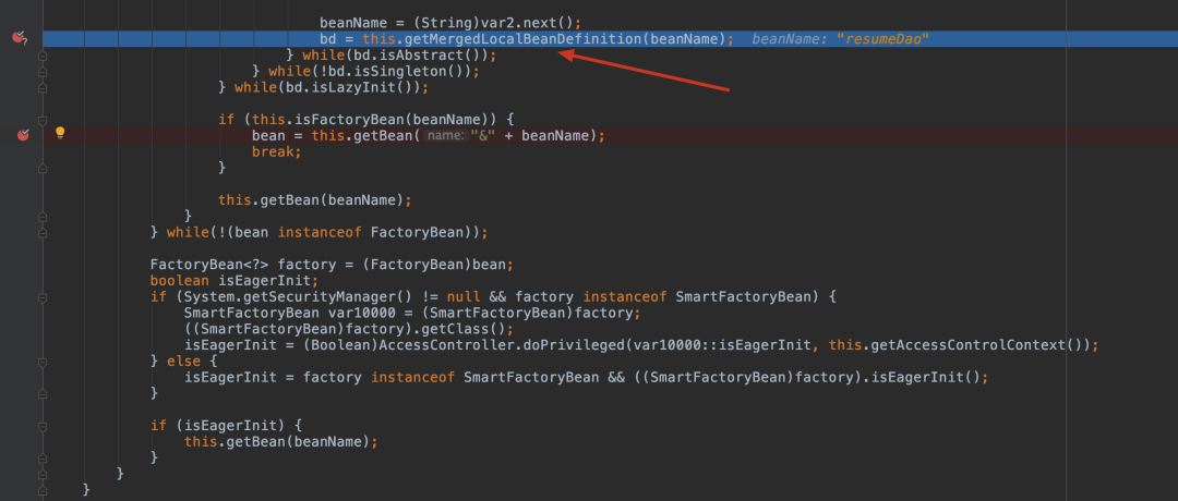 进入该方法以后,断点到这一行,输入beanName.equals("resumeDao")