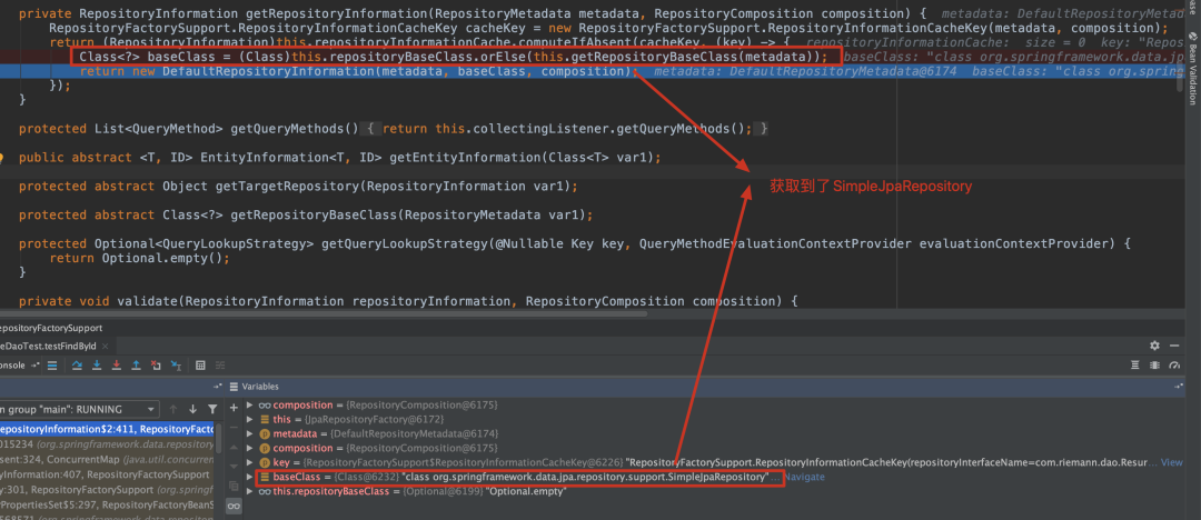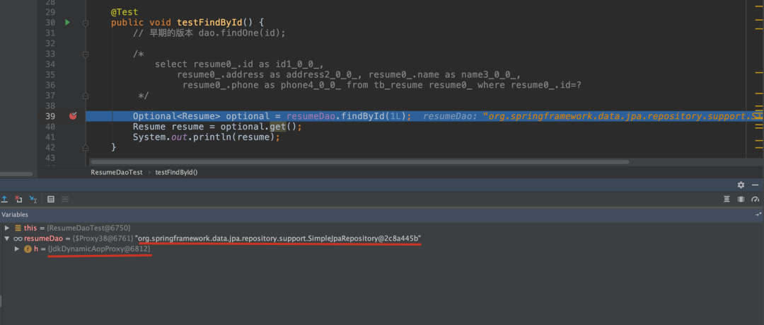 我们发现resumeDao是一个代理对象,这个代理对象的类型是SimpleJapRepository。代理对象在h里产生。