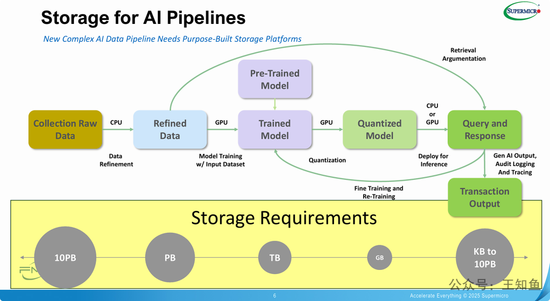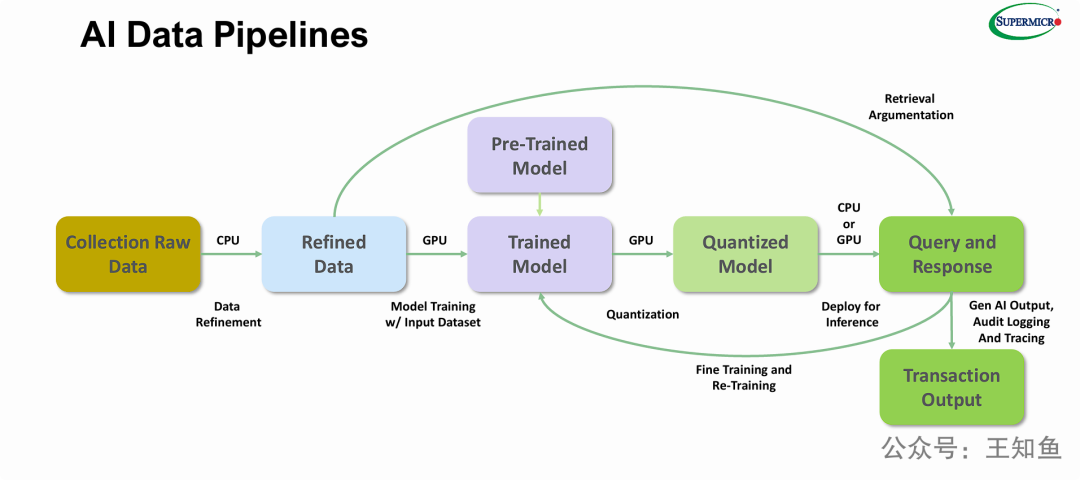 - (隐含的存储意义): 作为一个 AI 数据管道,这张图隐含了对多层存储架构的需求:需要大容量存储来“收集原始数据”;需要高性能、高吞吐的存储(如并行文件系统或高速闪存)来支撑 "Refined Data" 被 GPU 集群高速读取以进行“模型训练”;还需要快速的存储来加载 "Quantized Model" 并处理 "Query and Response" 阶段的日志和追踪数据。
