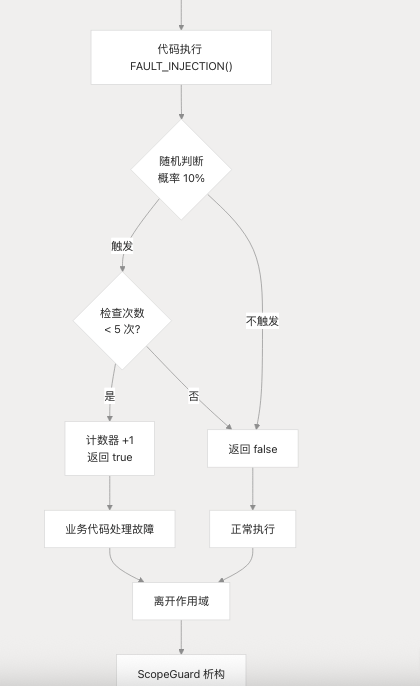 声明式 API: 通过 FAULT_INJECTION_SET(概率, 次数) 声明故障注入范围,具体故障类型由业务代码决定