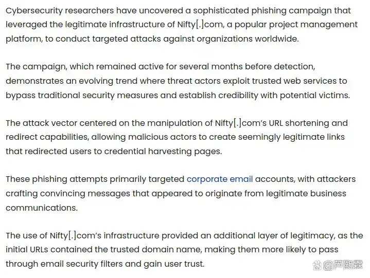 本文聚焦于此次Nifty.com滥用事件,旨在回答以下核心问题:(1)攻击者如何利用Nifty.com的合法功能构建钓鱼基础设施?(2)其采用的技术手段如何规避现有安全检测?(3)企业应如何调整防御策略以应对此类“可信平台钓鱼”(Trusted Platform Phishing, TPP)威胁?