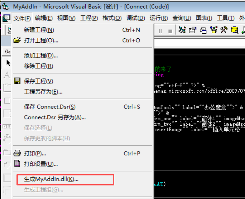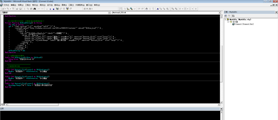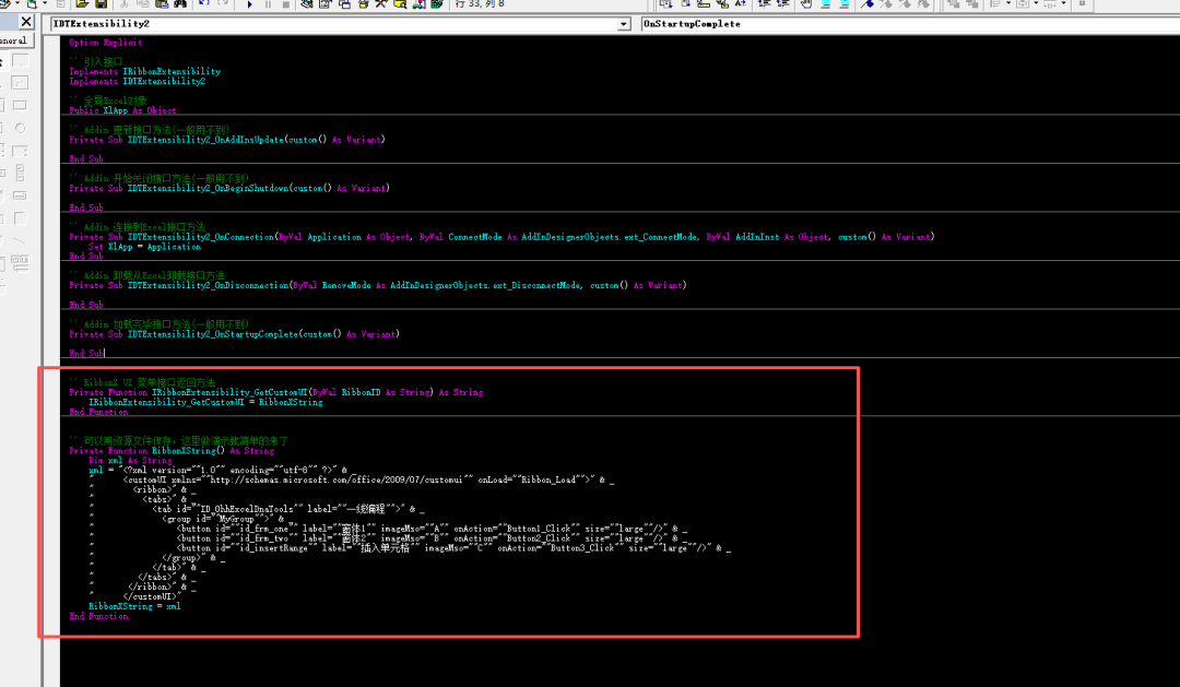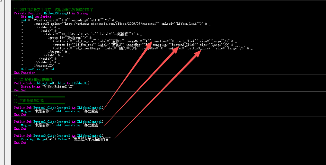 4.3.定义一个Xml文件或者xml字符串又或者res资源文件,用来定义Ribbonx菜单功能,我这里使用 xml字符串形式简单演示