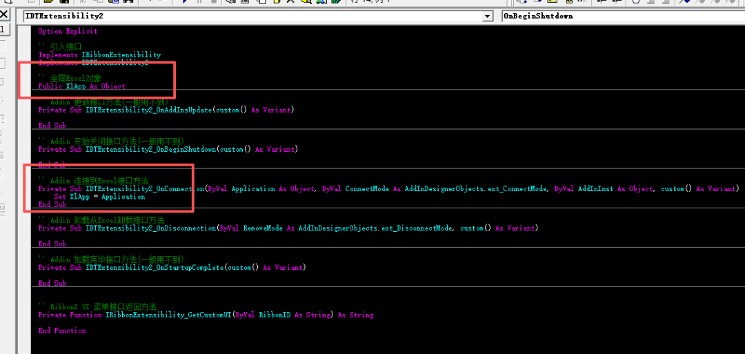 4.2.定义一个全局的XlApp Excel对象,注意Office2013后要Object类型,并通过IDTExtensibility2_OnConnection方法赋值