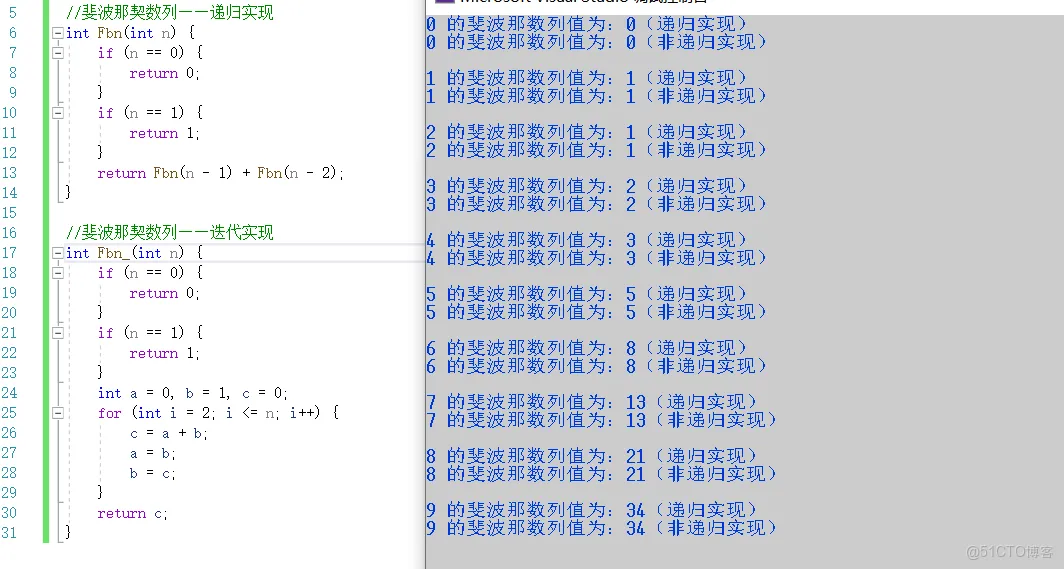 }上述的代码片段分别展示了斐波那契数列的递归实现与迭代实现这两种实现方式,下面我们先来看一下两个函数的测试结果: