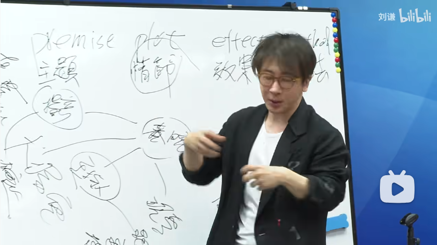白板上应该是主题、情节、效果和方法。基本结构和我的一致,其实我很多想法受他影响还是很大的,毕竟是从小看他节目长大的。但和我上一讲讲的几个小区别在于: