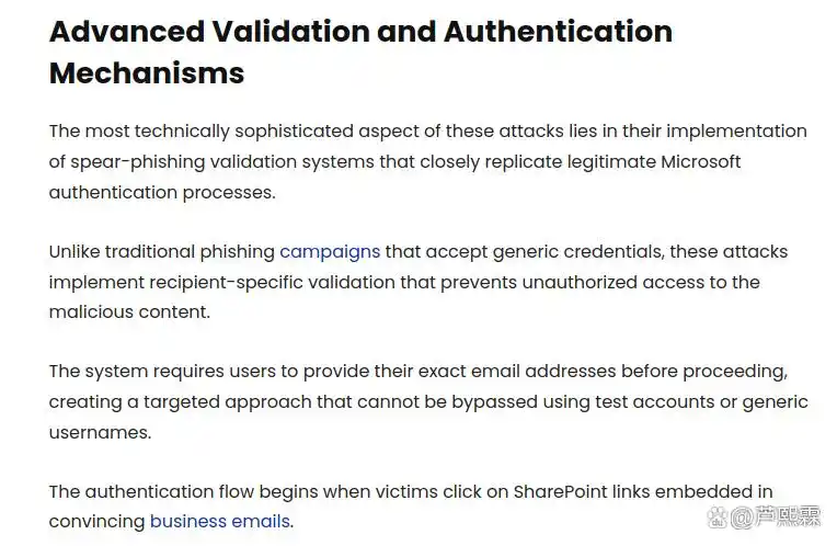 2025年中期以来,Cyberproof等多家安全机构相继披露了多起利用SharePoint实施的复杂钓鱼活动。这些攻击不仅绕过了基于URL黑名单、邮件网关过滤和沙箱检测的传统防护机制,还通过模拟微软原生认证流程(如MFA验证码交互),显著提升了欺骗成功率。尤其值得注意的是,攻击者引入了“收件人特定验证”机制,仅当输入目标用户的精确邮箱地址后,才触发后续恶意跳转,极大削弱了安全团队使用蜜罐账户或通用测试账号进行主动探测的有效性。