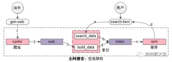 全网搜索引擎的宏观架构如上图,核心子系统主要分为三部分(粉色部分):
