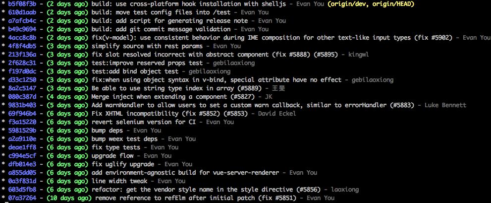天天在看vue源码时随手看了一下commit历史, 然后就被震惊了。请问这是怎么做到的?怎样的git实践才能做到这么清爽?