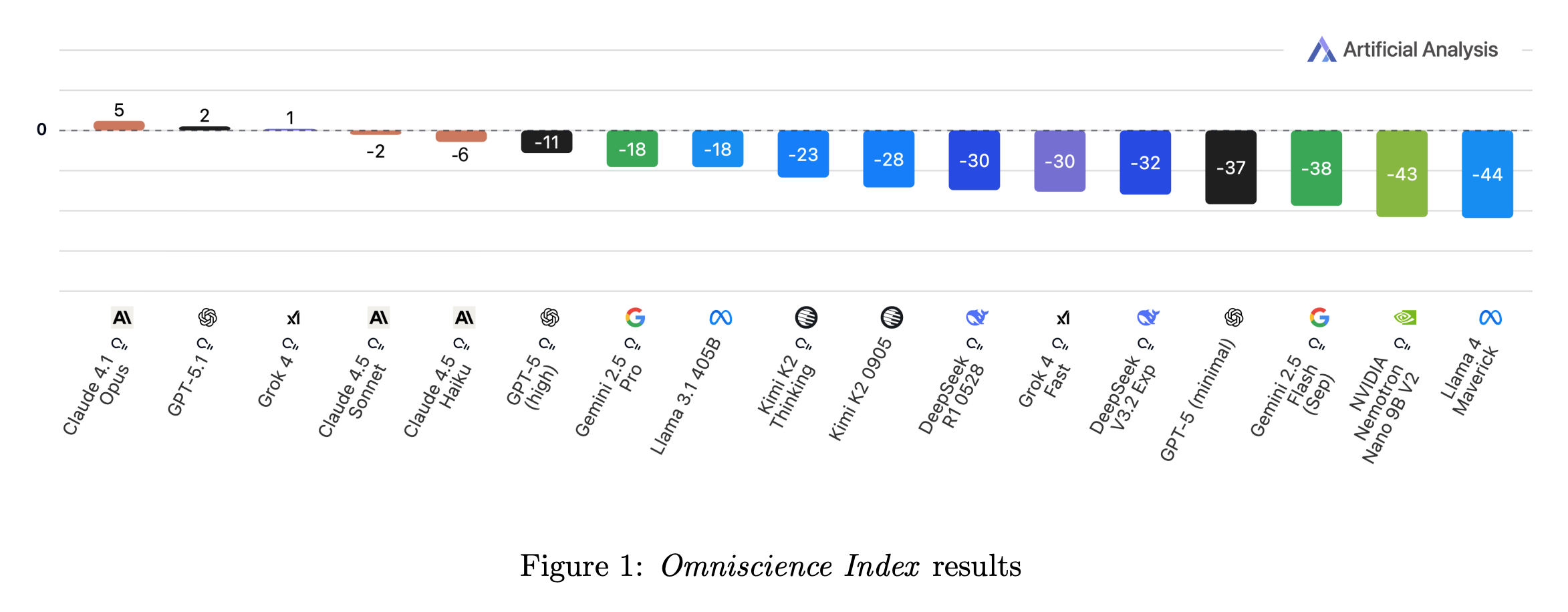 在欢呼声之外,Artificial Analysis 提出的 Omniscience Index (全知指数) 为我们提供了一个冷静的视角。Gemini 3.0 Pro 在该指数上虽然排名第一,但其具体表现却充满了矛盾性。