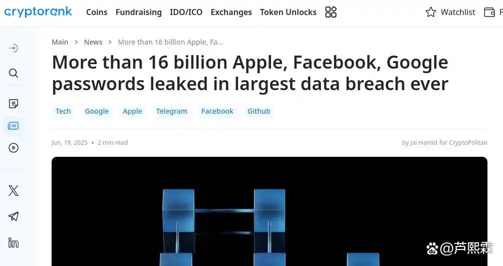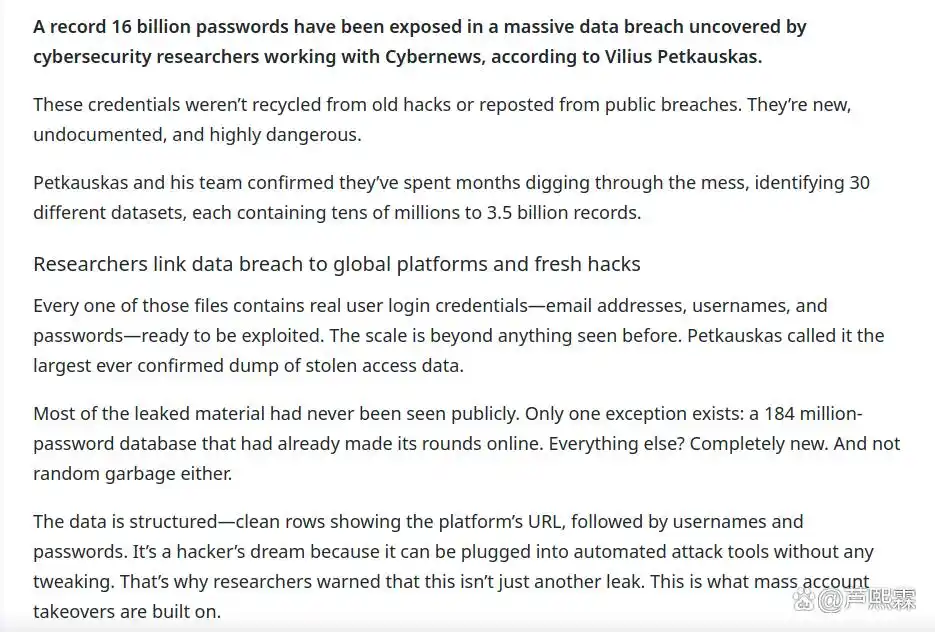 2025年6月,由Cybernews联合安全研究员Vilius Petkauskas披露的一起数据泄露事件引发全球关注:超过160亿条结构化用户凭证(包括邮箱、用户名与明文密码)在暗网流通,覆盖Apple、Google、Facebook、GitHub、Telegram等主流平台,部分甚至涉及政府与企业内部系统。与以往泄露事件不同,此次数据并非历史漏洞的重复利用,而是源自近期活跃的恶意软件(如Infostealer)采集、结构化打包并优化用于自动化攻击的新鲜凭证集。研究团队确认,其中绝大多数记录此前从未公开,且格式高度统一,可直接输入撞库工具实施大规模账户接管(Account Takeover, ATO)。