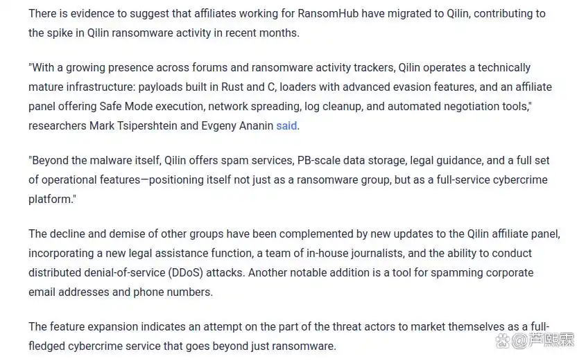 这些功能表明Qilin已超越传统RaaS模式,转型为“网络犯罪即服务”(Cybercrime-as-a-Service, CaaS)平台。