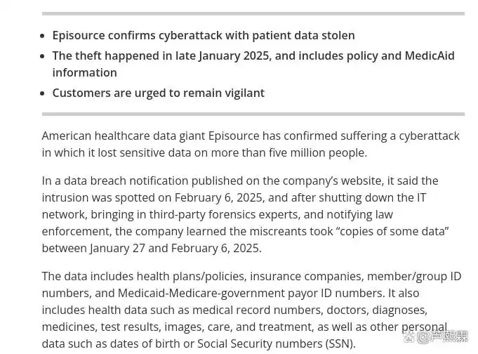 此类事件暴露出两个深层问题:其一,医疗机构普遍缺乏对第三方服务商的有效安全审计机制,往往仅依赖合规性声明而非技术验证;其二,服务商自身在数据存储与访问控制上存在严重疏漏,如明文存储社会安全号码(SSN)、未实施字段级加密、权限模型过于宽松等。更值得警惕的是,泄露数据包含可用于合成身份(Synthetic Identity)的多维信息组合(姓名+DOB+SSN+诊断代码),极大提升了后续金融欺诈与医保诈骗的成功率。