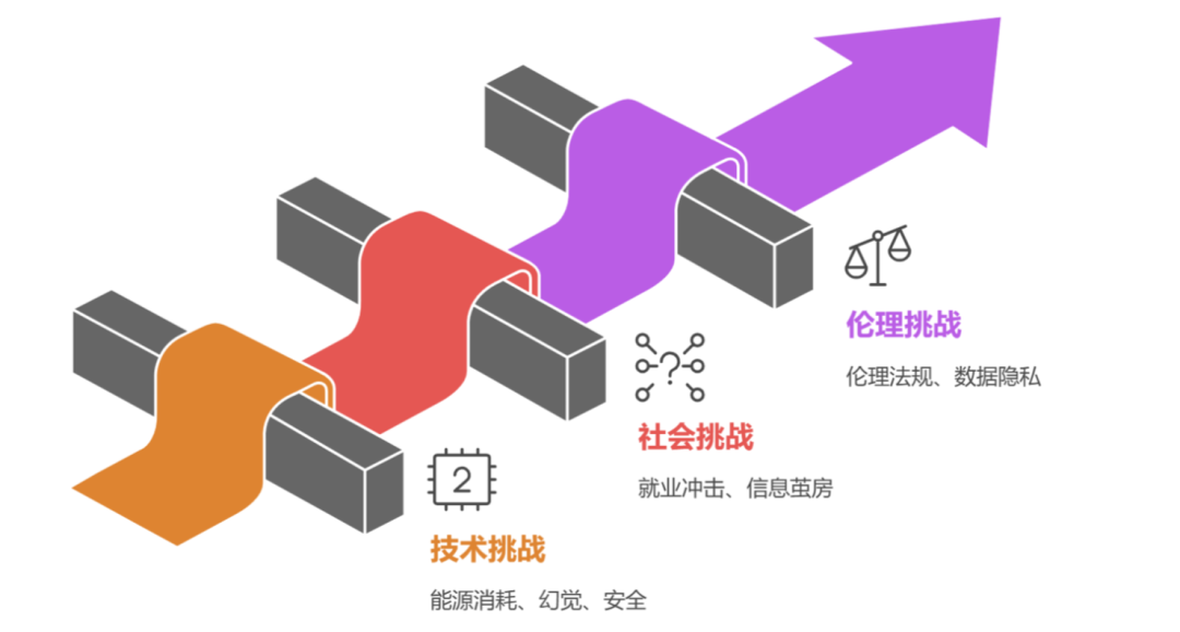 技术方面: AI在实际场景中的落地面临一些实际困难,比如幻觉的问题,还有如何确保它安全可控,不被乱用。