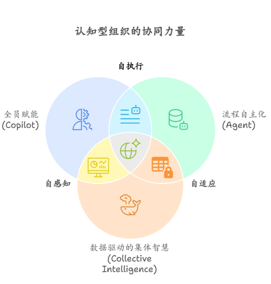 这种新型组织,基于数据驱动的集体智慧(Collective Intelligence)、全员赋能(Copilot)和流程自主化(Agent)三大技术支撑。AI辅助与智能体接管流程节点职能让组织具有了自执行的能力;人机深度融合加上数据驱动技术让组织具有了自感知能力;而流程自主化结合数据驱动决策让组织具有了自适应能力。