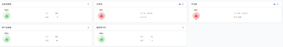 同时因为数据直接从 Kafka 消费,不再经过 ElasticSearch,所以 ElasticSearch 本身不再大量查询压力的同时,ElasticSearch 的稳定性状况也不再影响告警的准确性。在 Flashcat 提供的统一界面上,SRE 能够全局掌握系统健康状况,并快速深入到问题根源。以下从展示效果和运维效率两个方面总结落地成果:业务域健康概览(Flashcat 灭火图):如上图所示,星巴克将整体系统按业务域划分为“业务运营域”、“交易域”、“平台域”、“用户运营域”、“稳定性平台”等几大板块,每个板块下包含若干业务系统或服务。