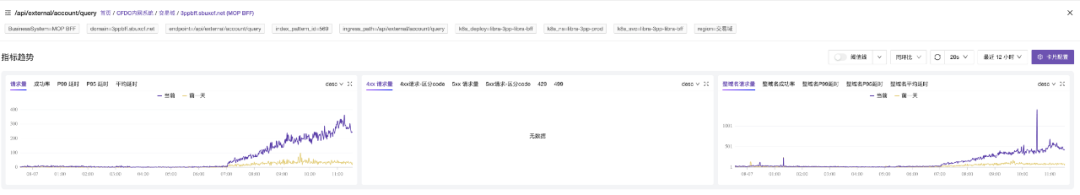 图中展示的是一个具体接口 /api/external/account/query 的实时指标:包括成功率、请求数、平均延迟等核心指标的当日、当周、当月、当季统计,以及下方详细的时间序列图表。例如“请求量”折线图、“成功率 %”曲线、“P99 延迟”柱状图、“5xx 次数”区域图等,一应俱全。