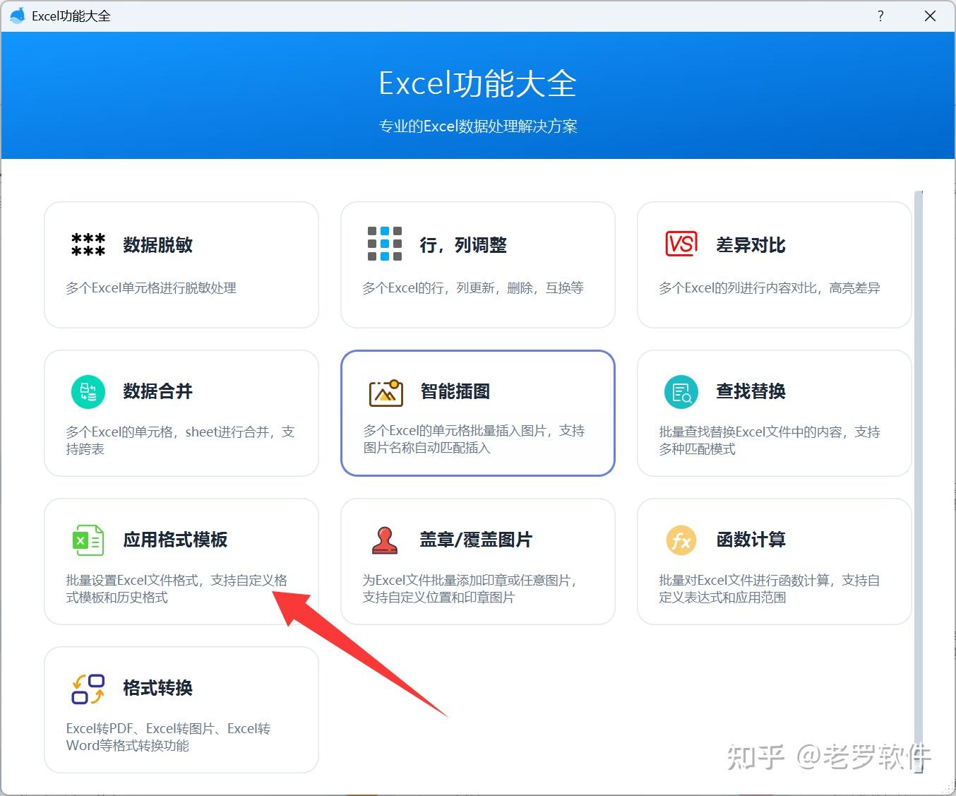 这是一个专业解决excel多文件处理的方案, 找到 Excel功能大全, 然后在弹出的框里点击 ”应用格式模板“。