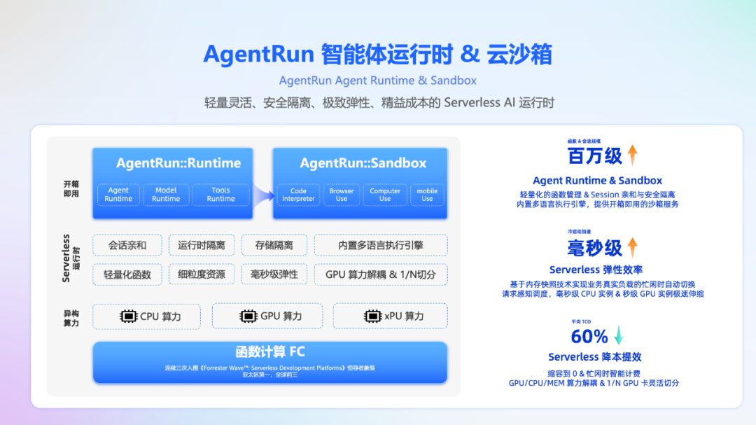 AgentRun 不是单一的性能优化工具,而是一套面向智能体时代的基础设施重构方案——在保证高可用与高安全的同时,真正让“百倍启动加速、TCO 平均降低 60%”成为企业落地智能体的现实起点。