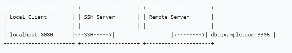 说明:本地客户端通过访问本地的8080端口,数据会通过 SSH 隧道传输到 SSH 服务器,再由 SSH 服务器转发到远端服务器db.example.com的3306端口。